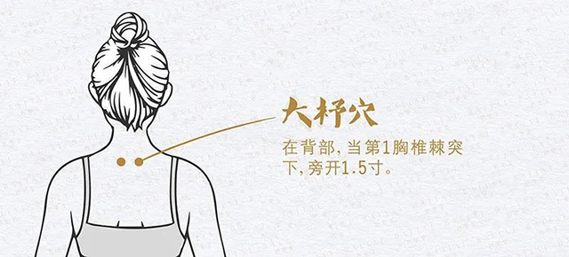 在背部脊柱區(qū),第1胸椎棘突下,后正中線旁開1.5寸。具有舒筋活絡,清熱解表,宣肺止咳。
